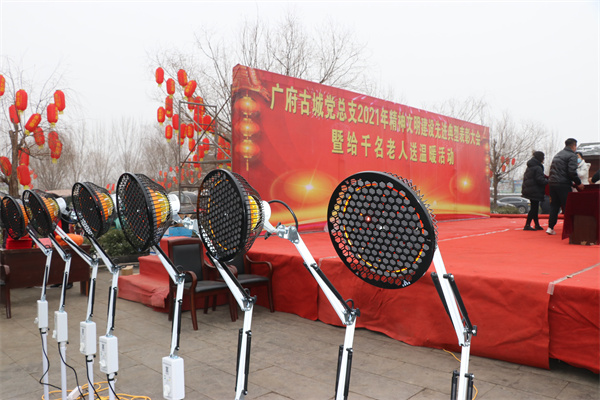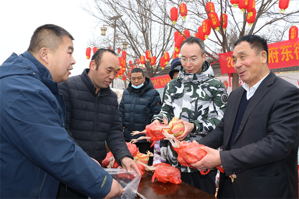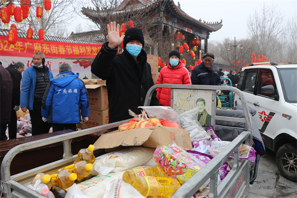 1月25日,永年区广府古城东街村村民在村委会门口上排起了长龙队,甘露寺广场上亦是搭起了舞台,台下坐满了70岁以上老人,现场每一个人们脸上都洋溢着灿烂的笑容。东街村委会门口两旁,整齐地码着米、面、油、肉、糖等十几种年货,今年是东街村党支部书记宋福如为村民置办年货的第十三个年头。据悉,今年为村民置办的年货种类达12样之多:2斤带鱼、1只白条鸡、2斤猪肉、1桶色拉油、1瓶香油、20斤大米、20斤精粉、10斤饺子粉、1袋糖块、1袋瓜子、1袋花生、1袋粉条,让全村人过春节不用再花一分钱。在保证村民日常需求之外,让村民新年品尝新味道,让东街村新年充满新气象!